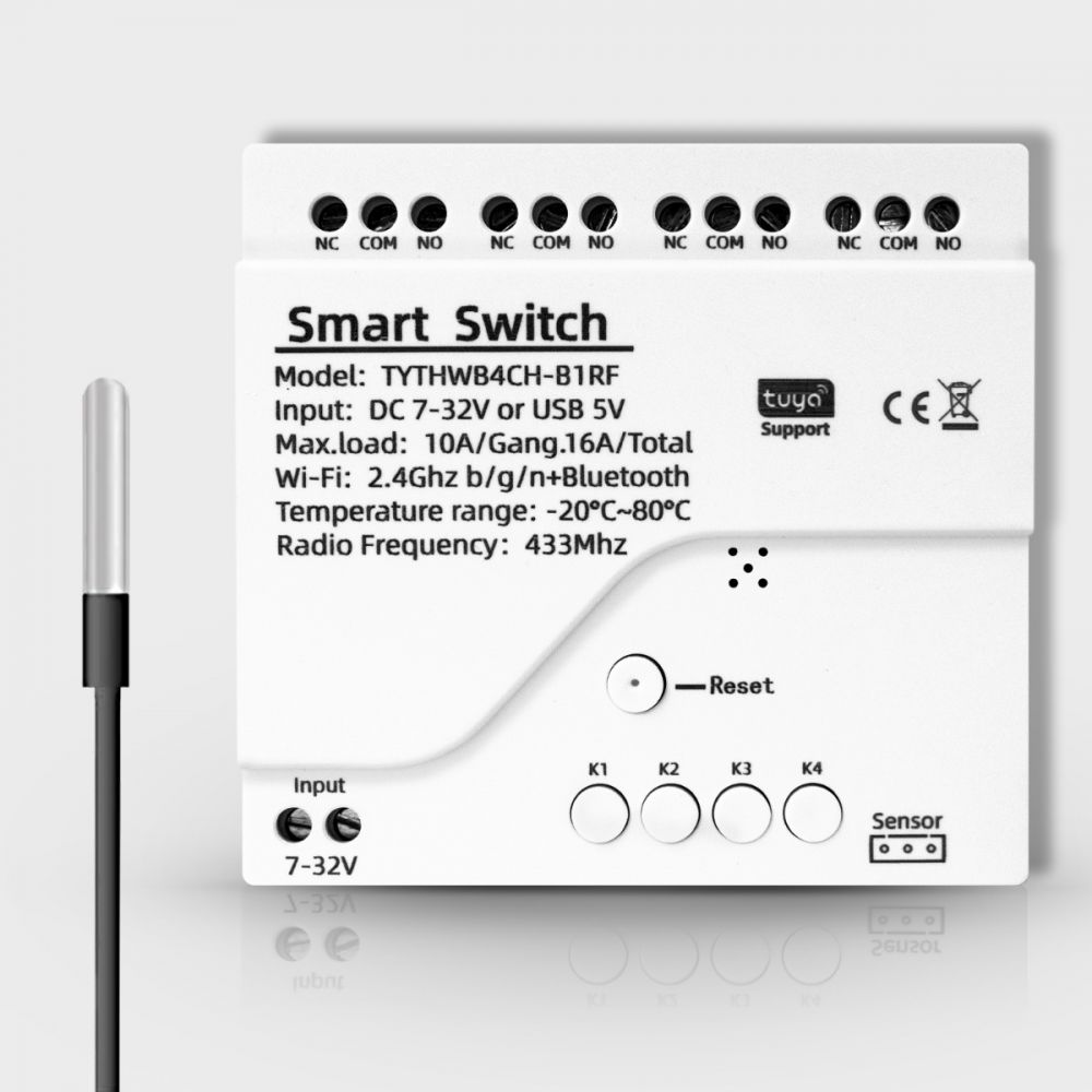 Четырехканальное WIFI реле c сухим контактом и влагозащищенным датчиком температуры Tuya (DC 7-32V)