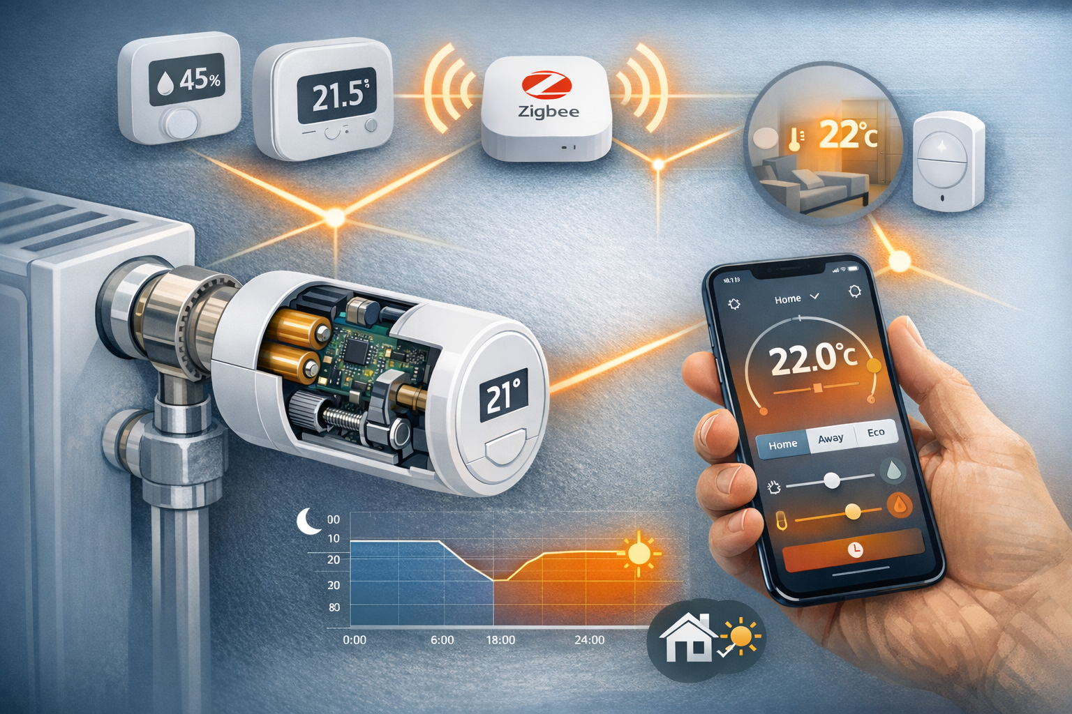 Термоголовка Zigbee функціонує завдяки батарейкам, мікроплаті, моторчику, який рухає шток, відкриваючи/закриваючи подачу теплоносія. Підключена до Zigbee хабу така термоголовка обмінюється даними, отримуючи команди з мобільного додатку чи від інших пристроїв.Розумний клімат контроль дозволяє інтегрувати терморегулятор Zigbee з іншими елементами, такими як датчики вологості або термостати, забезпечуючи синхронізовану роботу всієї системи. Наприклад, Zigbee терморегулятор аналізує поточну температуру в кімнаті та порівнює її з встановленим значенням, автоматично корегуючи нагрівання. Це дозволяє створити сценарії, детермоголовка програмована знижує температуру вночі для економії або підвищуючи її перед вашим поверненням додому. Вартість такого пристрою виправдана його надійністю і можливістю віддаленого моніторингу.